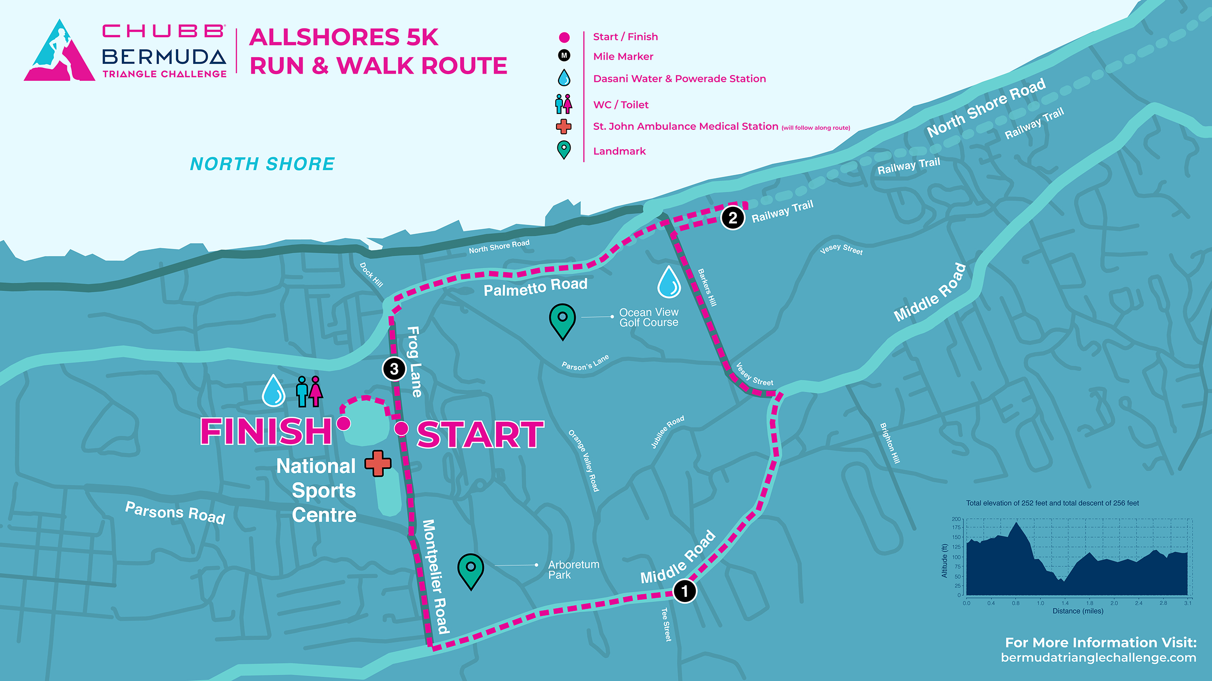 The 5k course begins and ends at the North Field of Bermuda’s National Sports Centre. Runners will head south on Montpelier Road to Middle Road until they reach Parsons Lane. They will take a left on Parsons Lane and run up Barkers Hill, through the scenic Ocean View Golf Club, until they reach the Bermuda Railway Trail. Here, they will take a right onto the Railway Trail for a brief out and back, giving them a bird’s eye view of the Atlantic Ocean, before continuing west on the Railway Trail to join the 10k course on Palmetto Road. From here, the 5k course traces the 10k course back to the finish: runners will follow Palmetto Road west, take a left onto Frog Lane and follow Frog Lane back to the finish at the North Field.