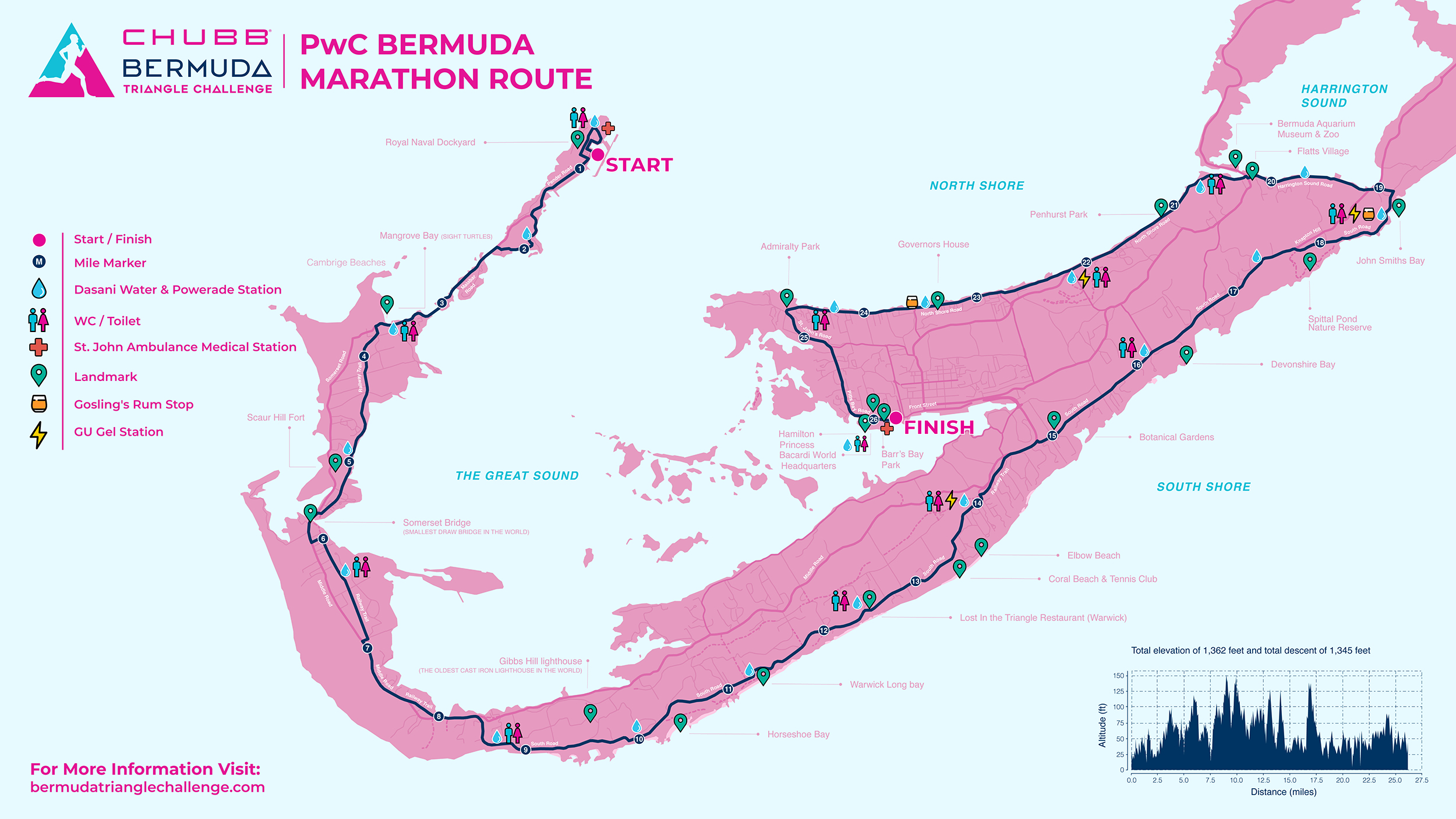 In 2020, the Chubb Bermuda Triangle Challenge debuted a new course for the PwC Bermuda Marathon. With the guidance and input of local runners who, collectively, have put in thousands of miles training in Bermuda, the original marathon course from 1975 (consisting of two 13.1-mile loops) was reimagined as a point-to-point running tour of the island.